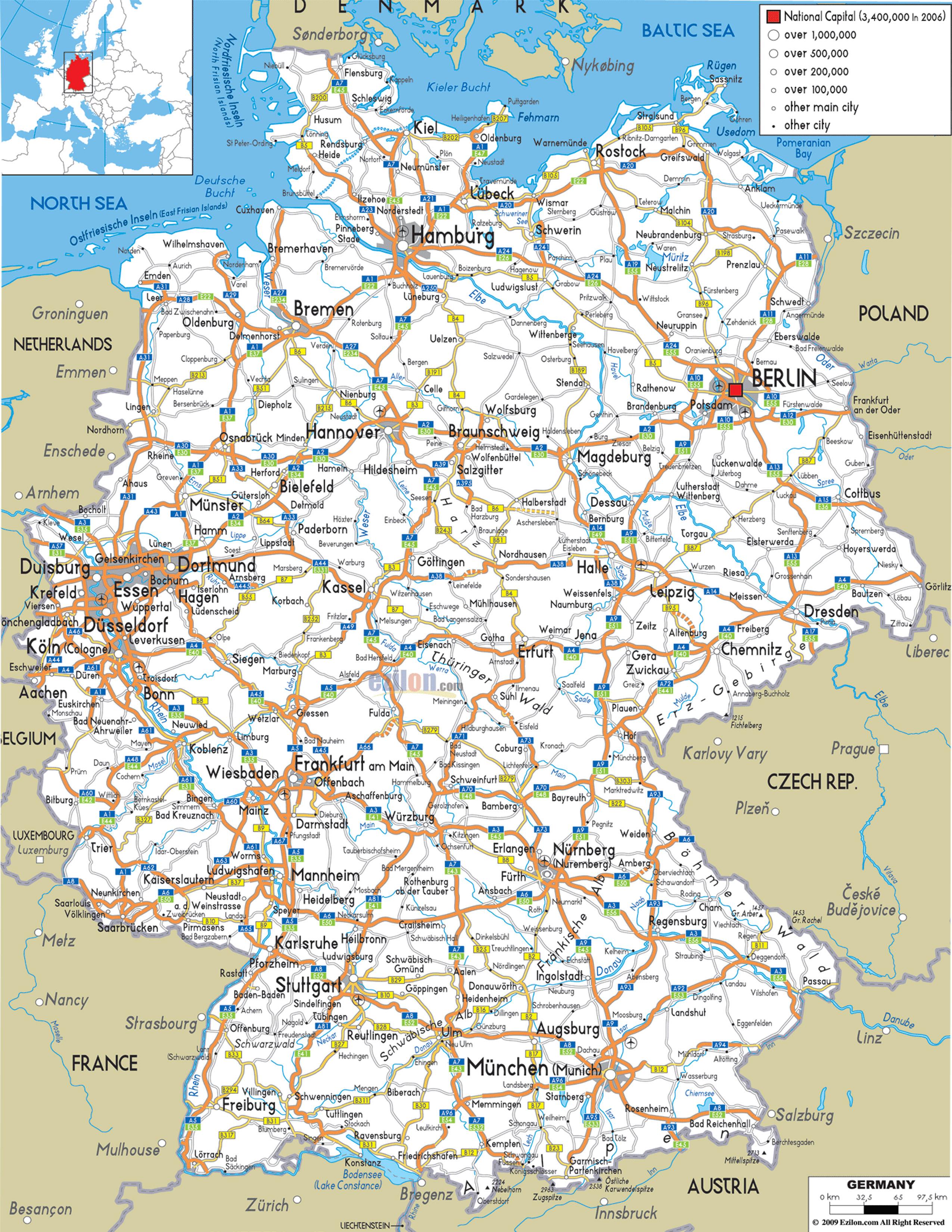 Карта Германии транспорт. Германия транспортные карты (Западная Европа - Европа) для печати. Германия транспортные карты (Западная Европа - Европа) для загрузки. Как густонаселенная страна, расположенная в центре Европы и имеющая развитую экономику, Германия имеет густую и современную транспортную инфраструктуру. Первая построенная система шоссейных дорог, обширная сеть немецких автобанов знаменит своими участками, на которых не действует ограничение скорости. Самым важным водным путем страны является река Рейн. Самый большой порт - это порт Гамбурга. Аэропорт Франкфурта является крупным международным аэропортом и европейским транспортным узлом. Авиаперелеты используются на большие расстояния внутри Германии, но сталкиваются с конкуренцией со стороны государственной сети железных дорог Deutsche Bahn. Высокоскоростные поезда, называемые ICE, соединяют города для пассажирских перевозок, как показано на транспортной карте Германии. Во многих городах Германии есть системы скоростного транспорта, а общественный транспорт доступен в большинстве районов. После воссоединения Германии потребовались значительные усилия для улучшения и расширения транспортной инфраструктуры на территории, которая ранее была Восточной Германией.